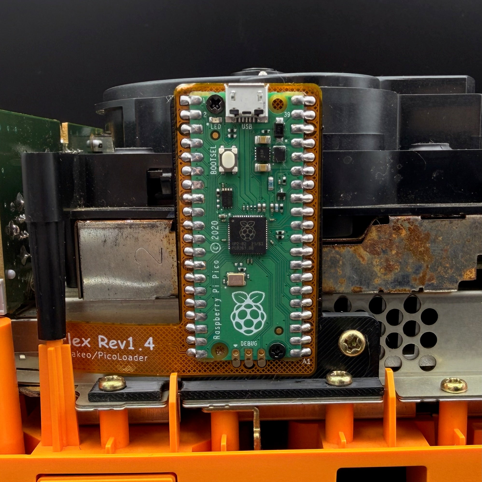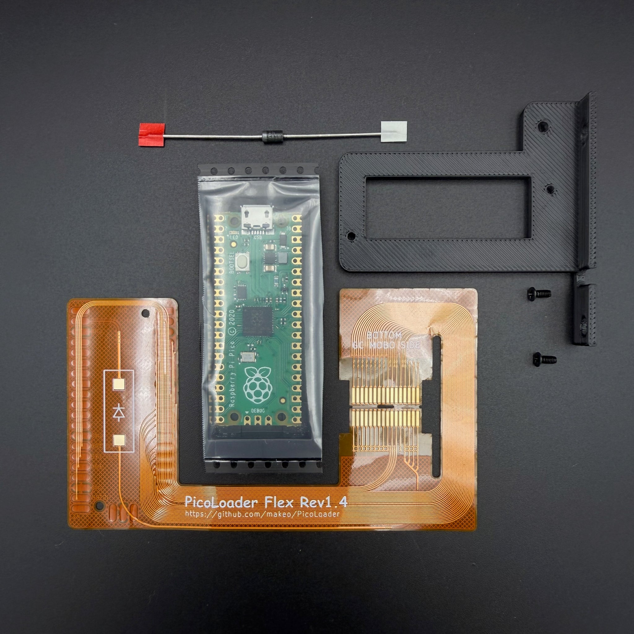 Pre-soldered option will have the Pi Pico and diode soldered to the flex and screwed into the 3D printed bracket.  Extra caution will be necessary to fold and insert the flex into the drive connector as damaging it will require a replacement flex and pi and diode desoldered from the damaged one and resoldered to the replacement.